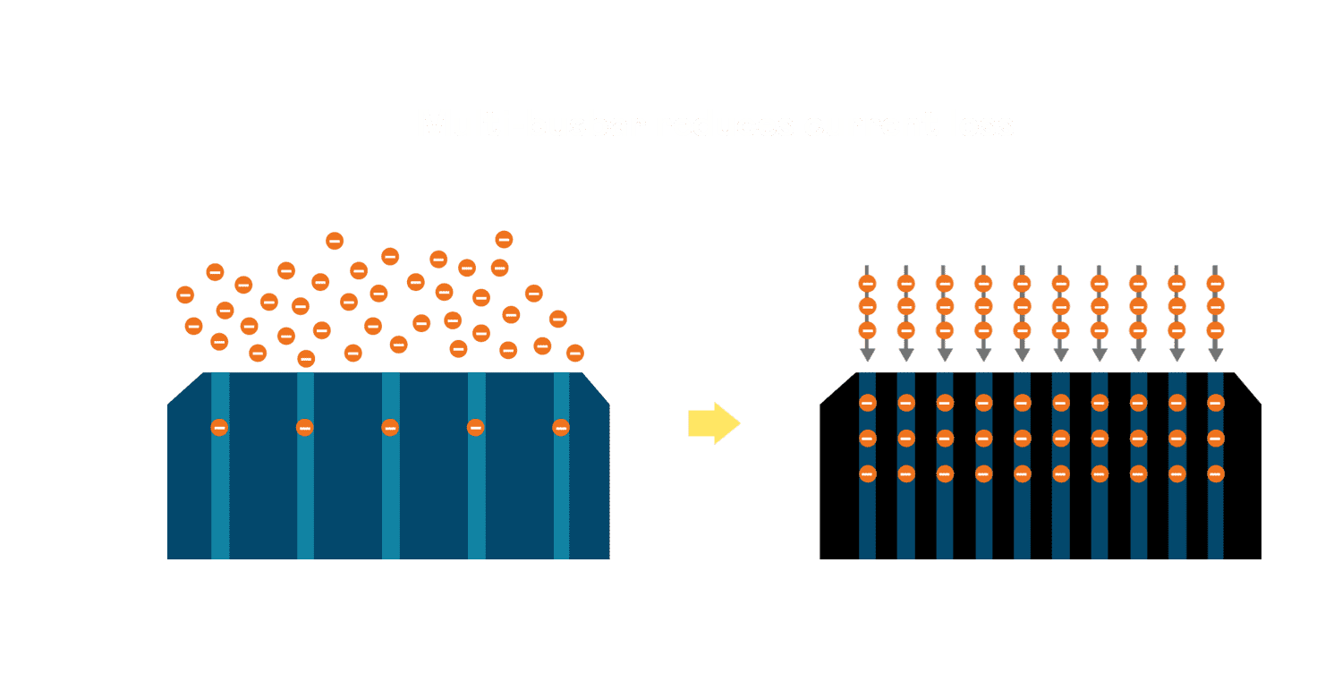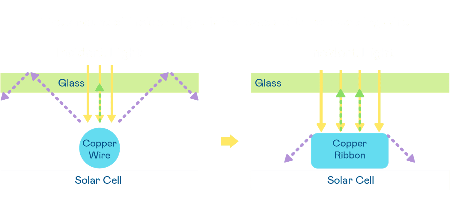 • 电池使用多条铜导线 (Copper wire) 于电池片上形成较短的电流路径,,,提高电流收集效率,,,,采用圆形设计的铜导线较传统扁平式的铜焊带 (Ribbon),,,,可增加入射至电池的光线量。。。。