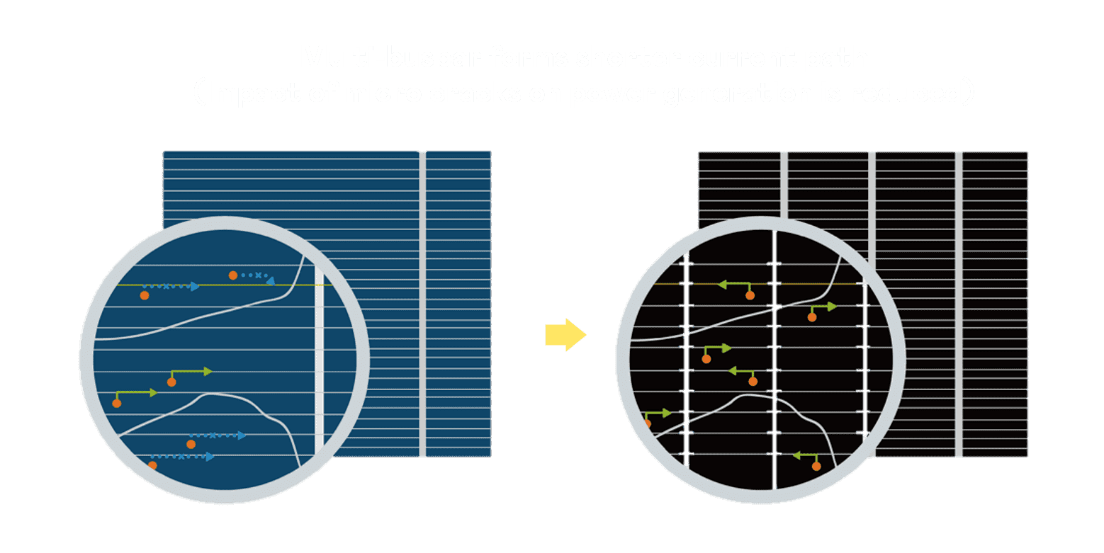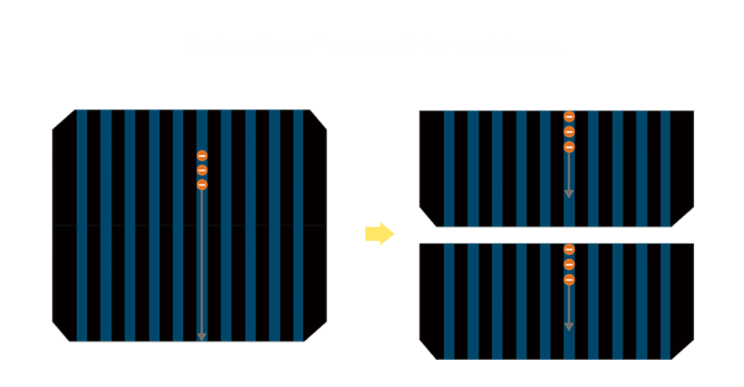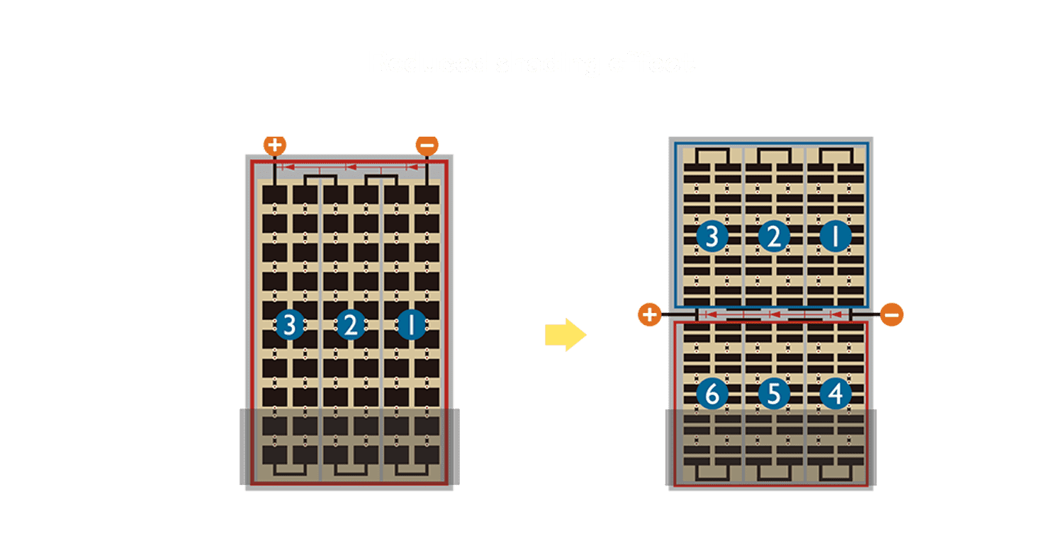 • 结合半切电池,,,,降低遮阴影响、、提升模组抗隐裂能力、、并减少电阻损耗,,,进一步提升模组发电效能。。。