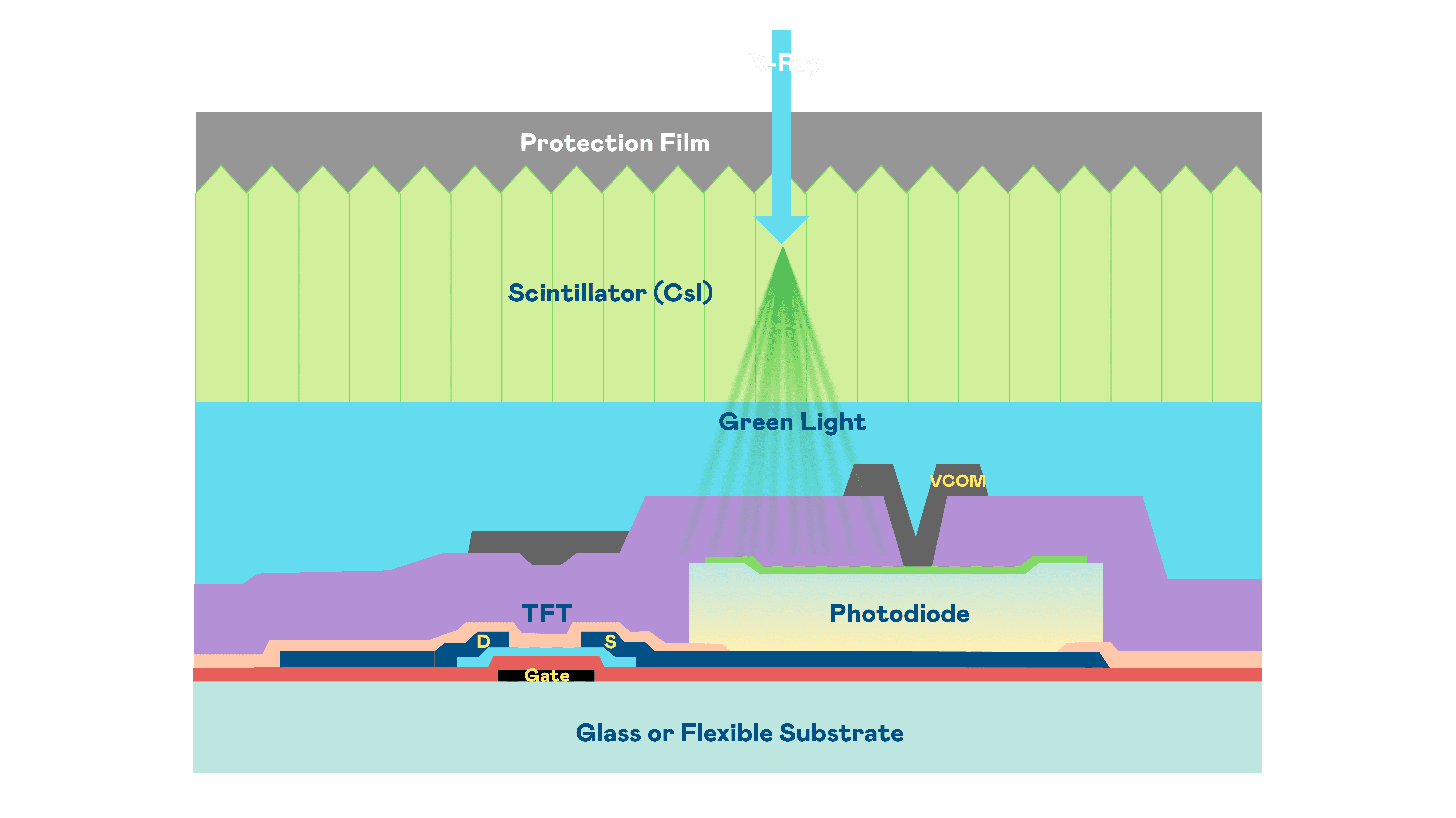 银河集团的X光影像感测阵列使用薄膜电晶体 (TFT) 作为每个像素的读取开关,,,,搭配光电二极体(Photodiode)的光电转换元件,,,,用以感测X光影像讯号。。。